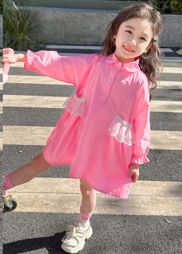 Elegant Pink Peter Pan Collar Patchwork Button Kids Long Shirts Dress Fall SS1049