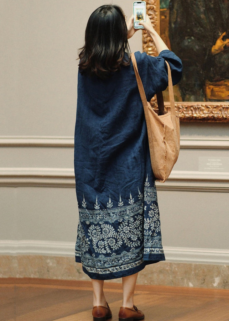 French Blue Button Print Maxi Dresses Long Sleeve MN054