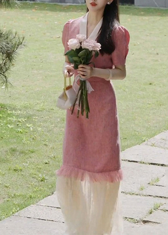 French Pink Tulle Patchwork Tops And Skirts Two Pieces Summer EE1016