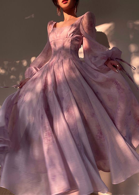 Discover the essence of sophistication with our French Purple Square Collar Patchwork Chiffon Dress, featuring exquisite lantern sleeves for a touch of artful elegance.