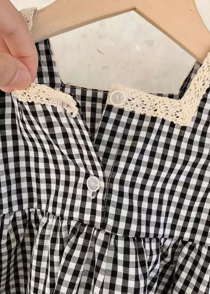 Handmade Black Square Collar Plaid Lace Patchwork Cotton Kids Mid Dress Sleeveless GF020