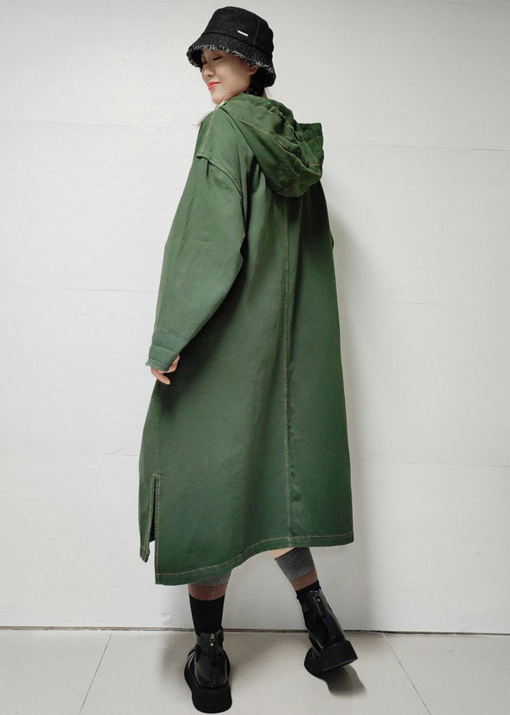 Loose Army Green Hooded Pockets Denim Long Trench Coat Fall MN038