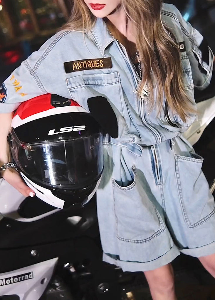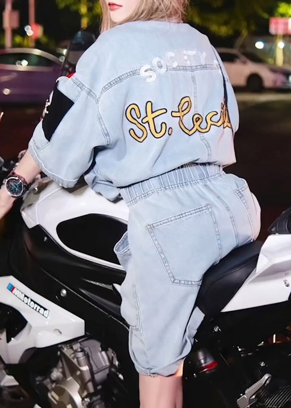 Experience effortless chic with our Loose Blue Peter Pan Collar Patchwork Pockets Denim Jumpsuit for a luxurious summer style upgrade.