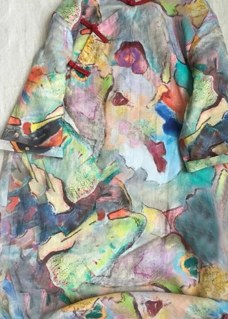 Loose Colorblock Stand Collar Button Print Cotton Dress Half Sleeve GH1027