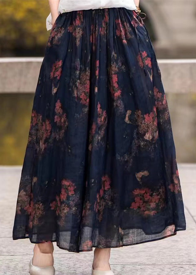 Loose Green Elastic Waist Print Linen Skirts Summer LK030