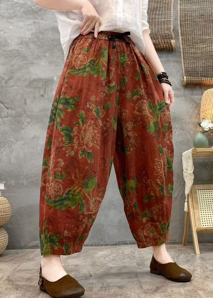 Loose Red Print Pockets Linen Crop Pants Summer GG057