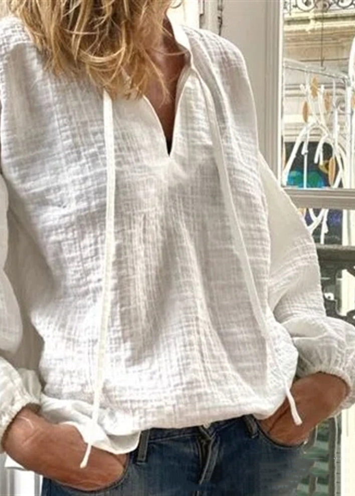 Exude elegance and refinement with our Loose White V Neck Lace Up Solid Linen Blouses, featuring long sleeves for a sophisticated and stylish appearance.