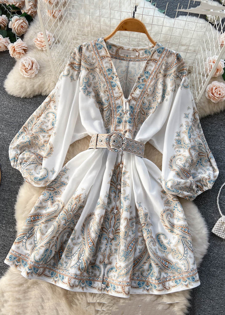 Loose White V Neck Print Cotton Mid Dress Long Sleeve TR052
