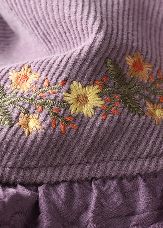 These lantern pants are made with modern purple embroidered lace and feature a high waist, ruffled patchwork design. They offer a stylish and elegant look with a touch of delicate craftsmanship.