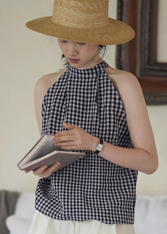 Natural Navy Blue Cold Shoulder Plaid Lace Tie Vest Sleeveless UU1007