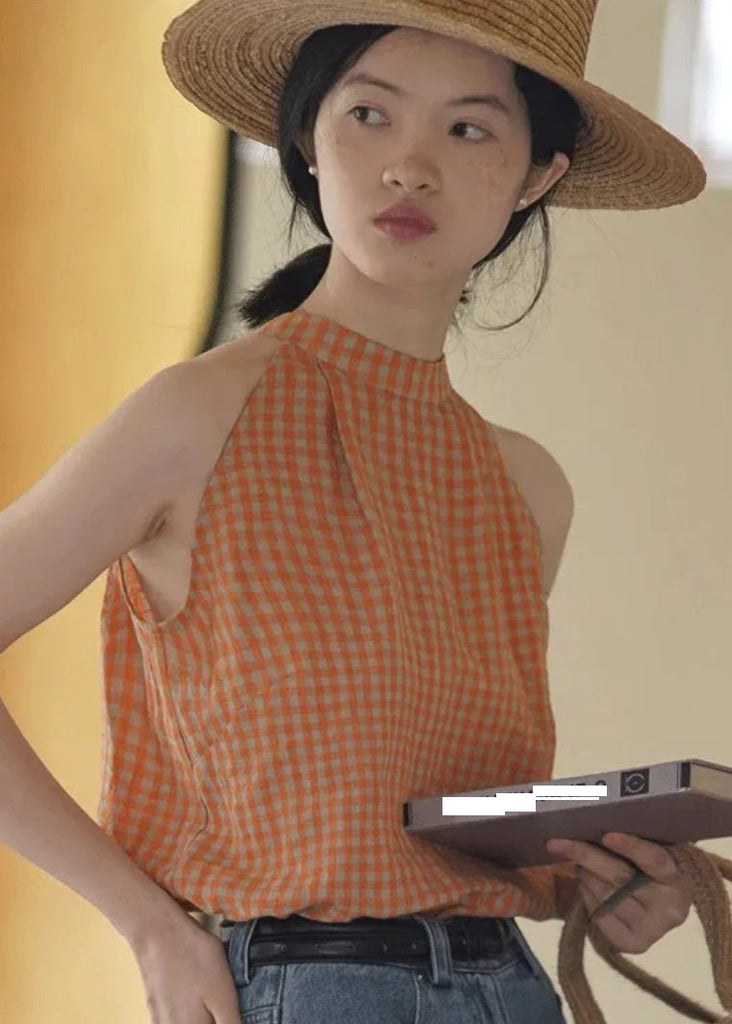 Natural Navy Blue Cold Shoulder Plaid Lace Tie Vest Sleeveless UU1007 SH-LF-VTP240526