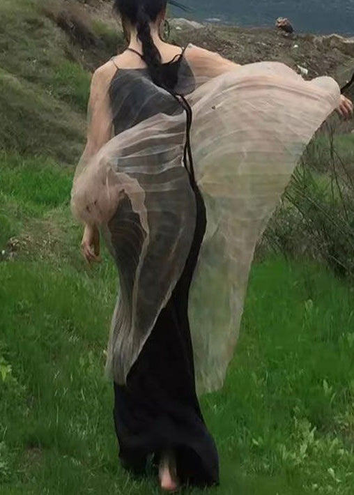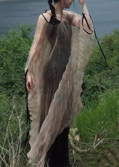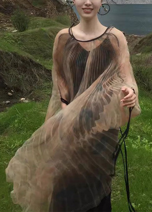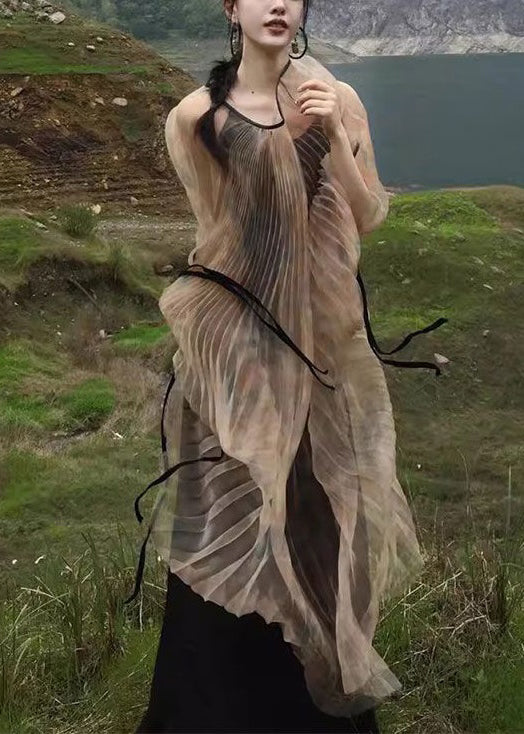 New Khaki Wrinkled Lace Up Tulle Two Pieces Set Long Sleeve XX088