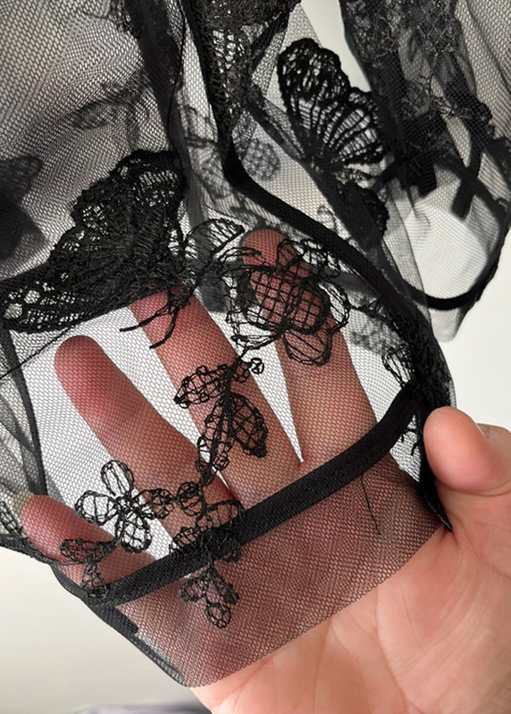 Oversized Black Notched Butterfly Embroidered Men Tulle Shirt Summer TR010