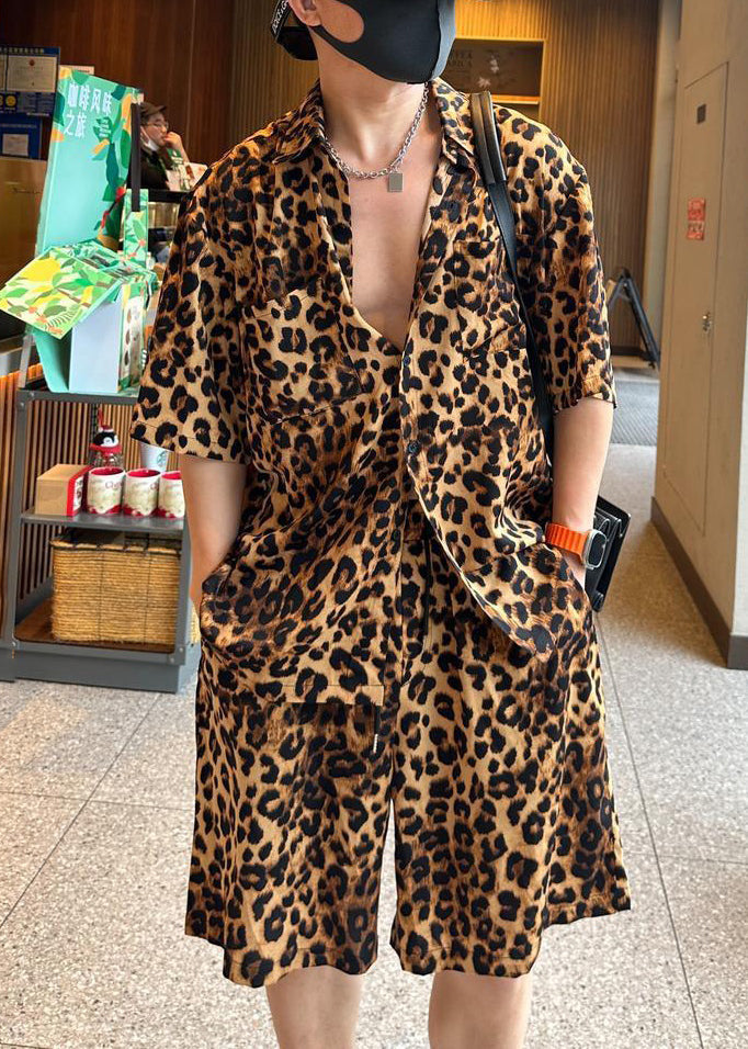 Plus Size Leopard Peter Pan Collar Pockets Cotton Mens Two Pieces Set Summer HG053