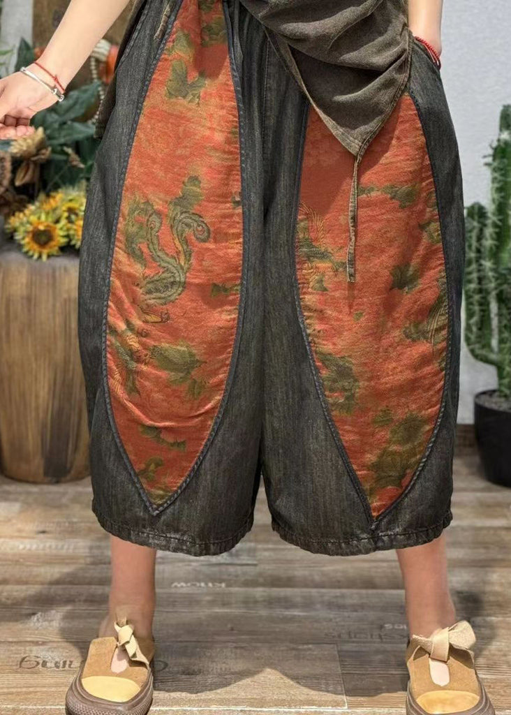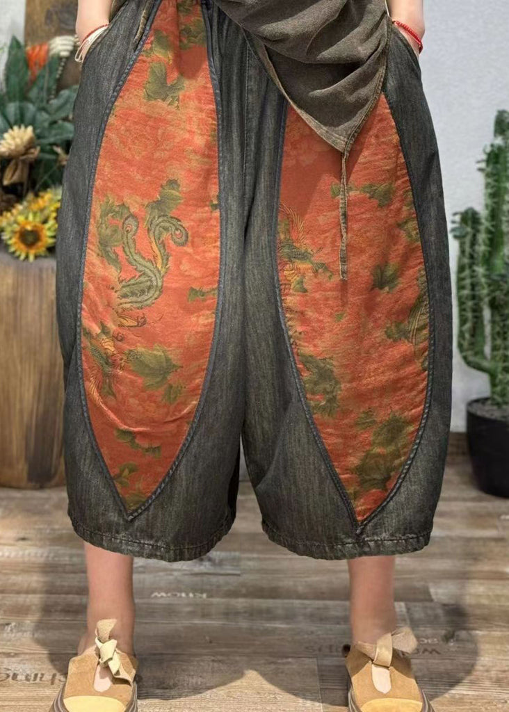 Retro Print Splicing Ethnic Style Cotton Crop Pants Summer BV082