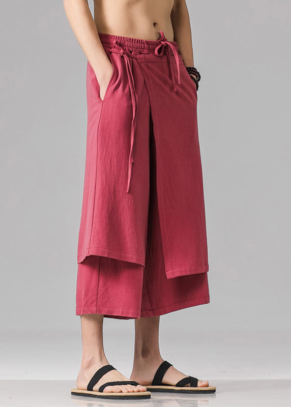 This pair of men's pants features a stylish red color and a unique patchwork design, complete with a convenient tie waist for adjustability. Perfect for staying cool and comfortable during the summer season.