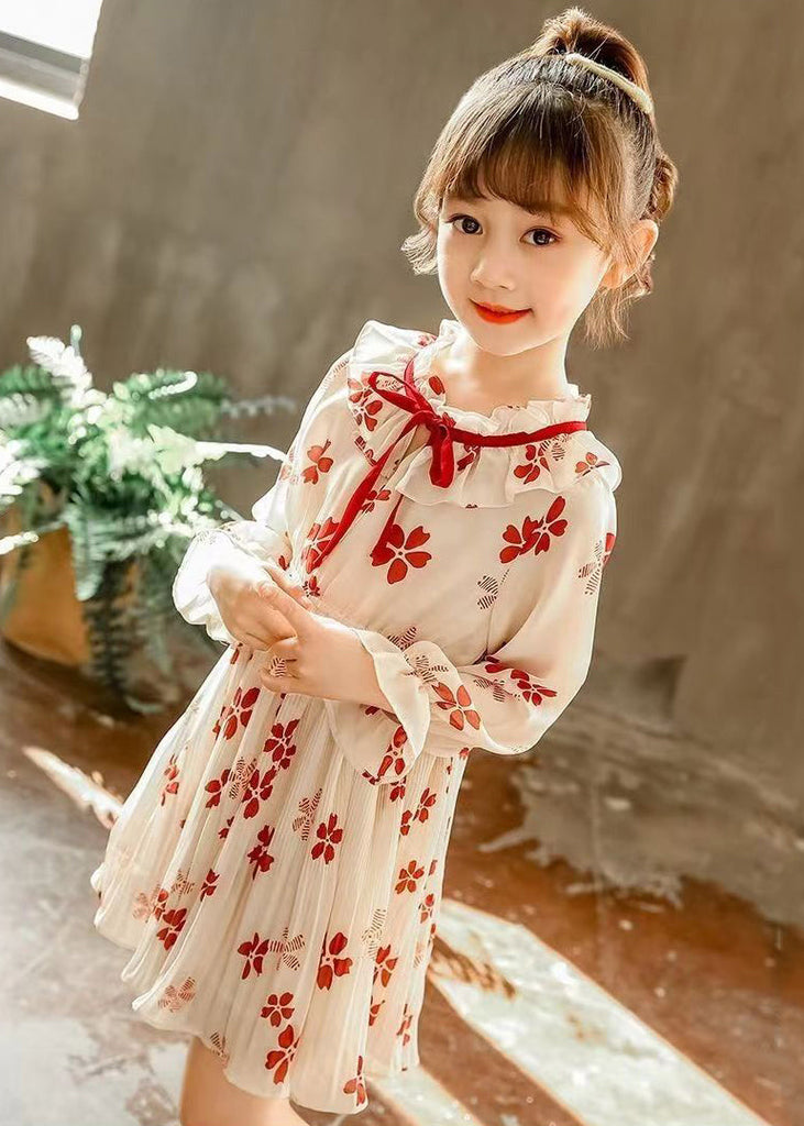 Stylish Red Ruffled Print Lace Up Chiffon Girls Dresses Flare Sleeve XZ098