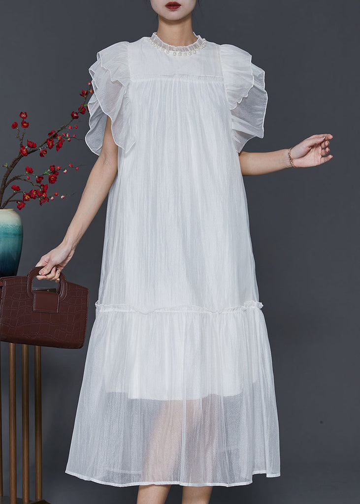 White Silk Long Dress Ruffled Nail Bead Petal Sleeve SD1068