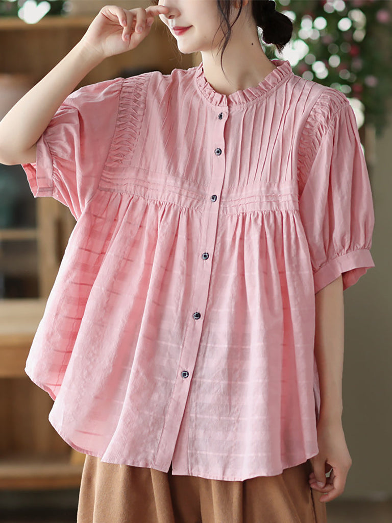 Women Artsy Shirred Stripe Cotton Agaric-Lace Shirt OP1006