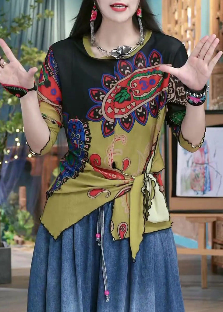 Women Colorblock Print Lace Up Cotton Top Long Sleeve ZL028
