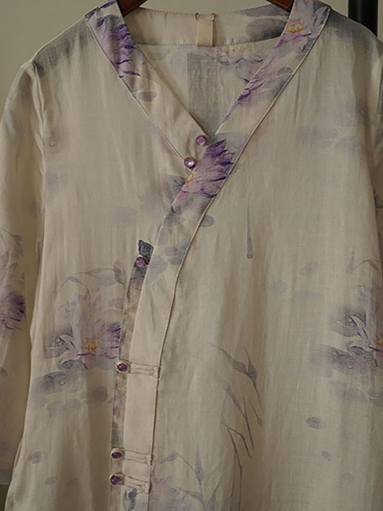 Women Ethnic Flower Button V-Neck Ramie Dress OO1002