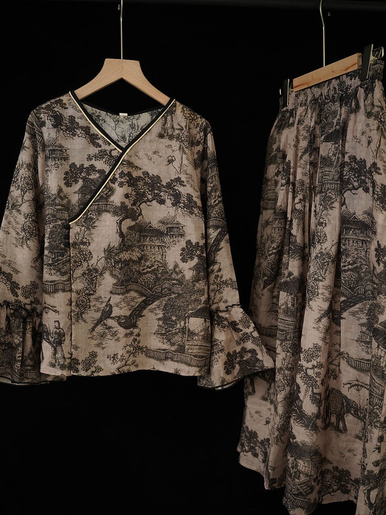 Women Ethnic Print V-Neck Ramie Loose Shirt+Skirt RR1032