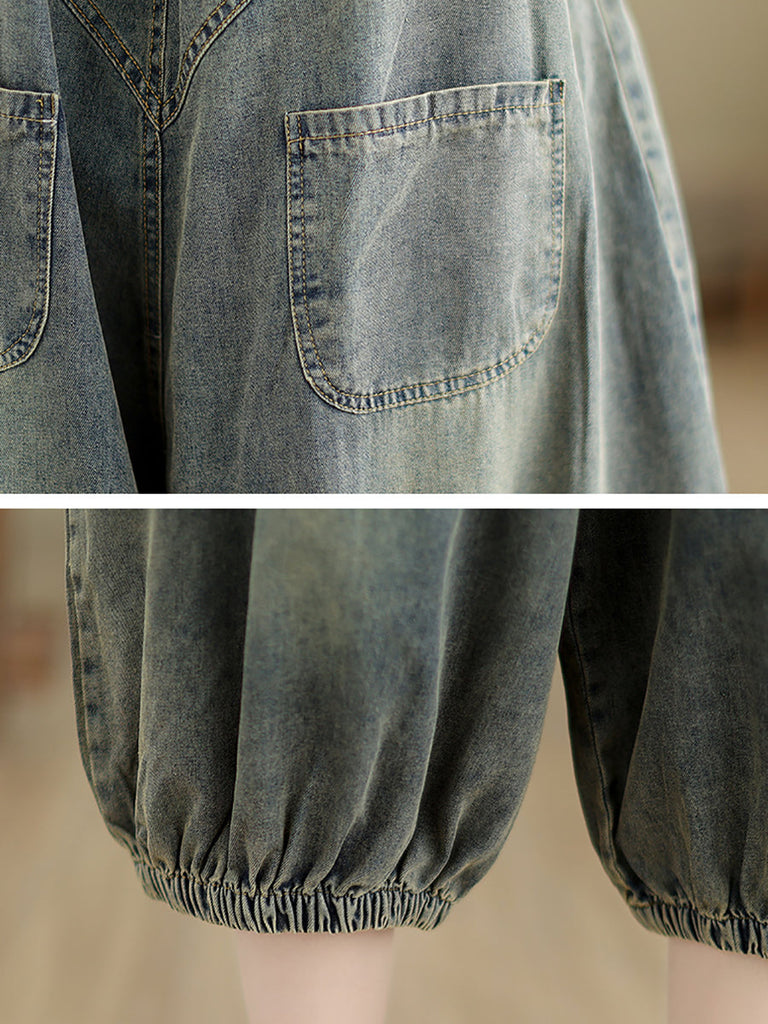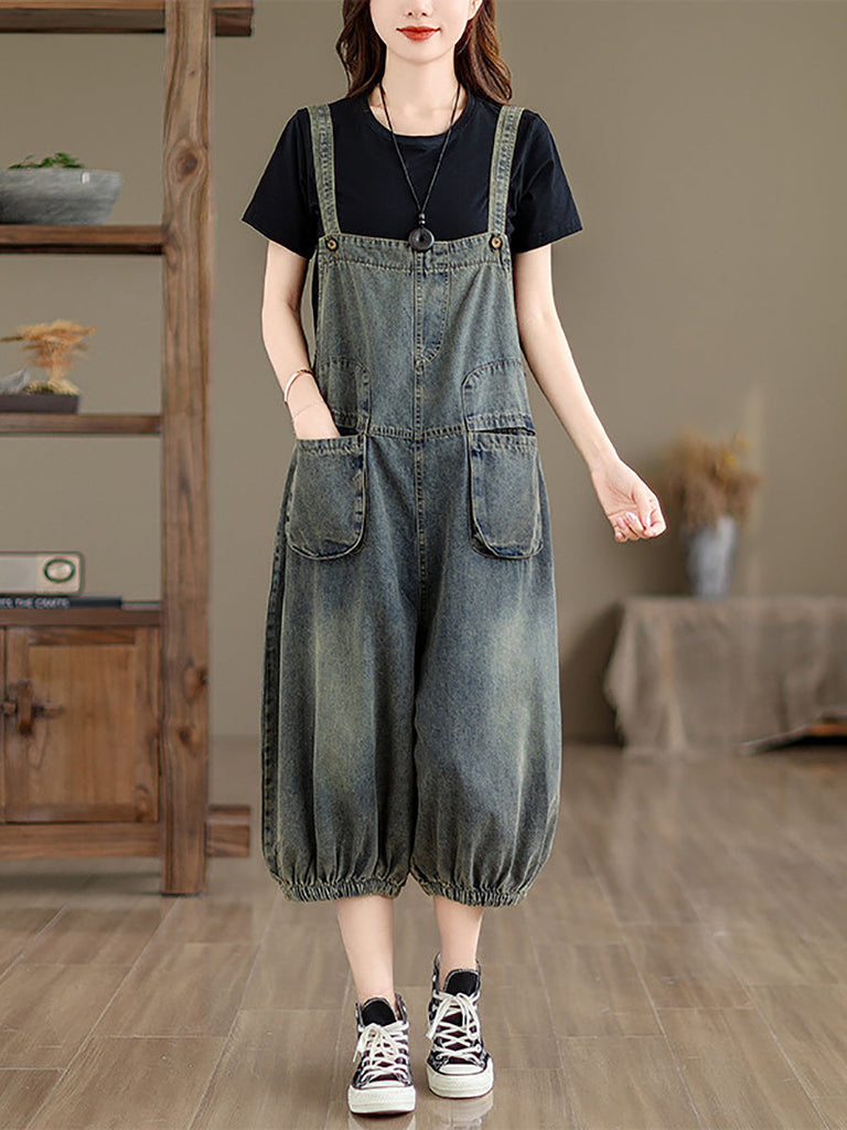 Women Retro Summer Solid Pocket Denim Jumpsuits FG1035