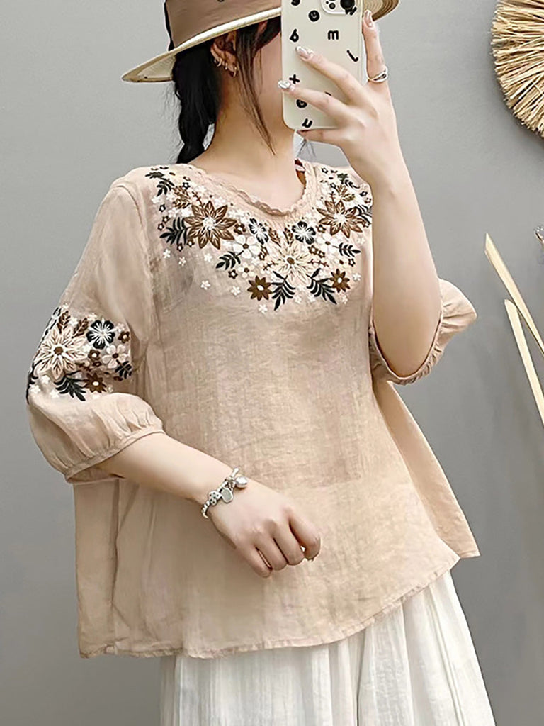 Women Summer Artsy Embroidery O-Neck Ramie Shirt HH005