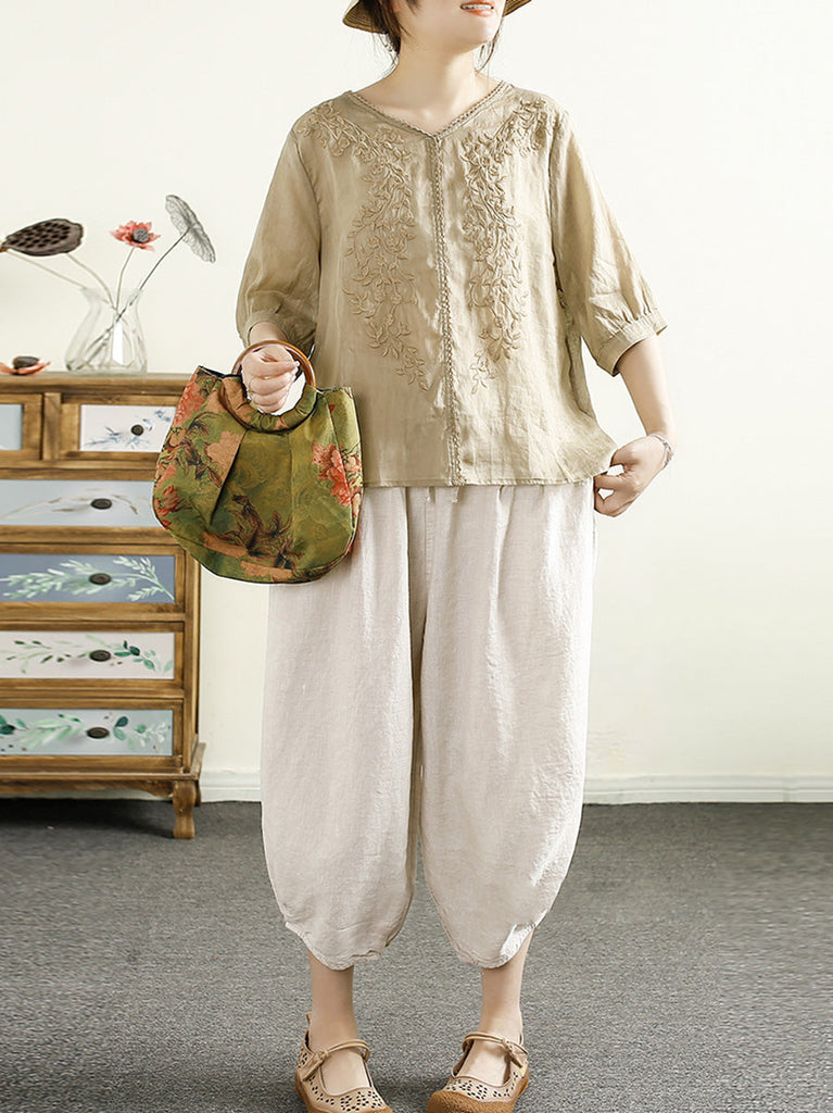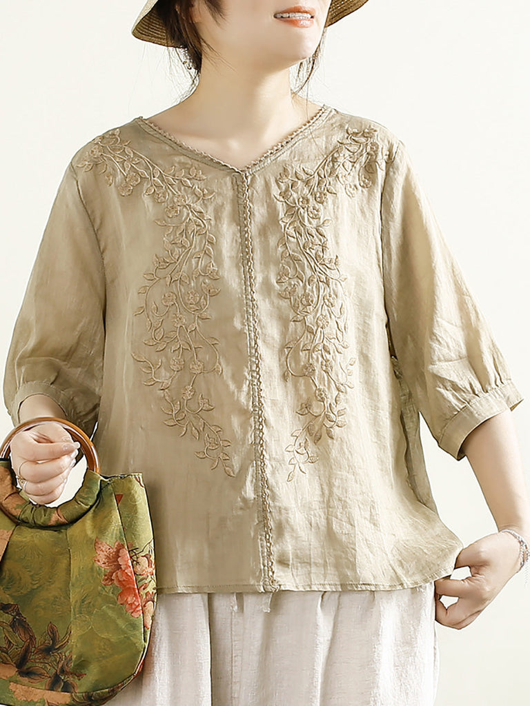 Women Summer Artsy Embroidery V-Neck Ramie Shirt PP1020