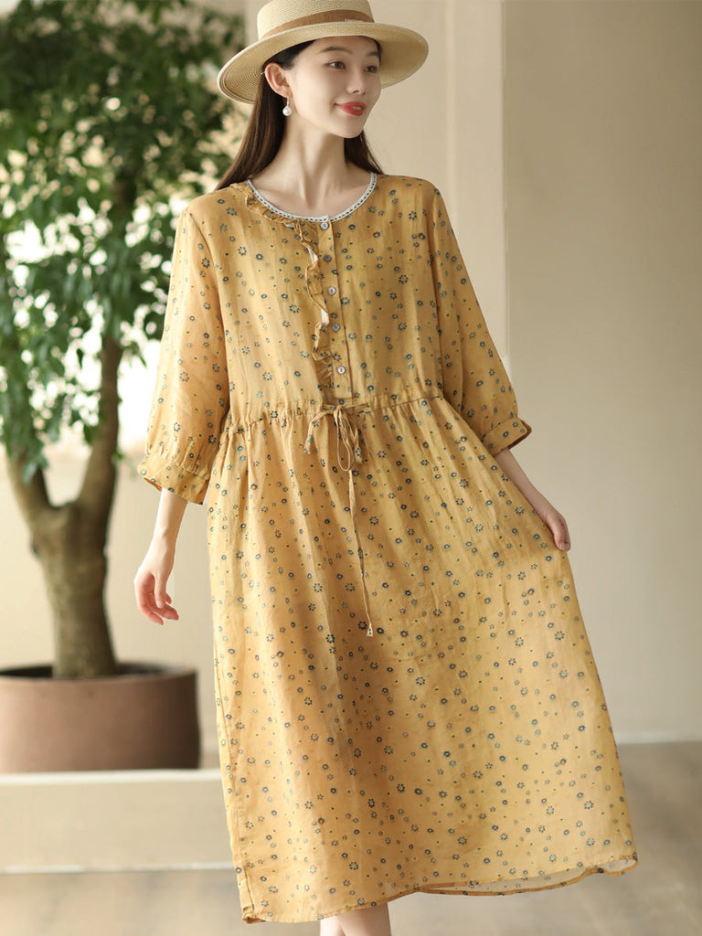 Women Summer Artsy Floral O-Neck Strap Ramie Dress FD010