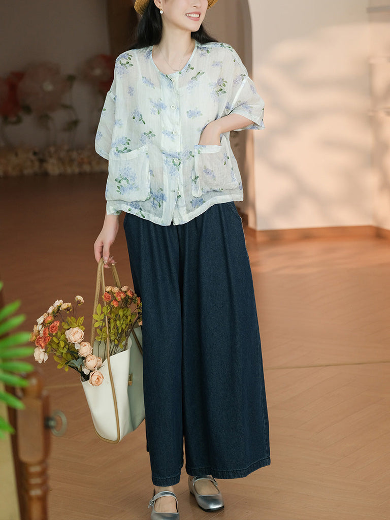 Women Summer Artsy Flower Button-up Pocket Ramie Shirt CC047
