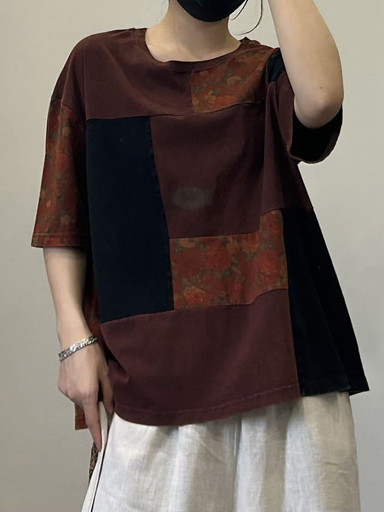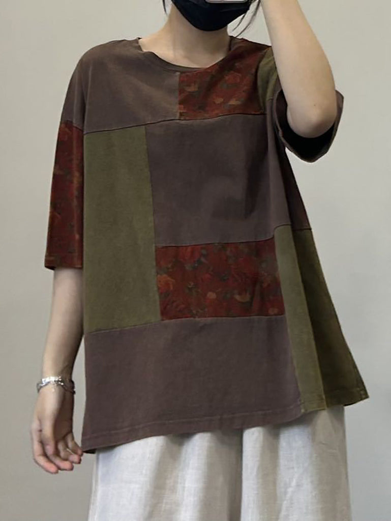 Women Summer Artsy Patch Spliced Cotton Pullover Shirt OP1053