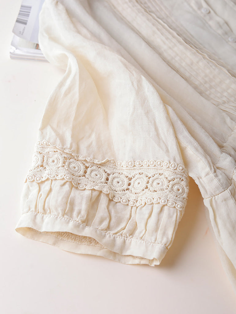 Women Summer Artsy Shirred O-Neck Lacework Ramie Dress CX030