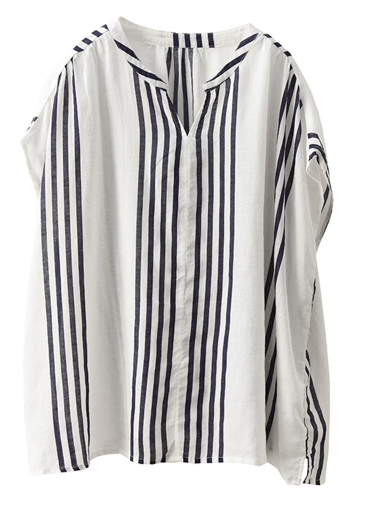 Women Summer Artsy Stripe V-Neck Thin Linen Shirt CV1053