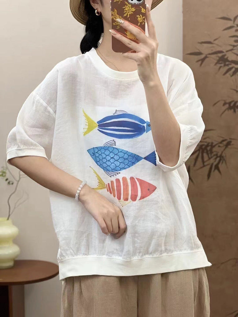 Women Summer Casual Fish Print O-Neck Ramie Shirt PP1007