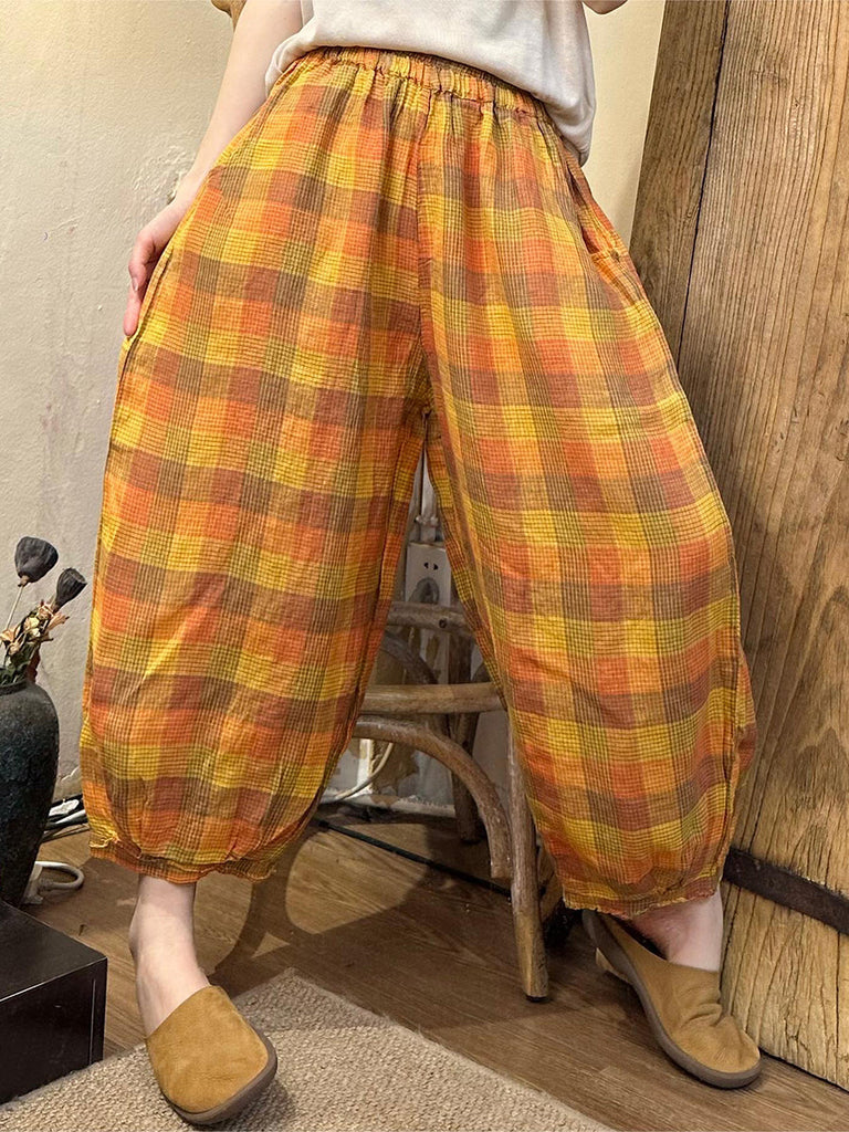 Women Summer Casual Plaid Linen Harem Pants OO1024