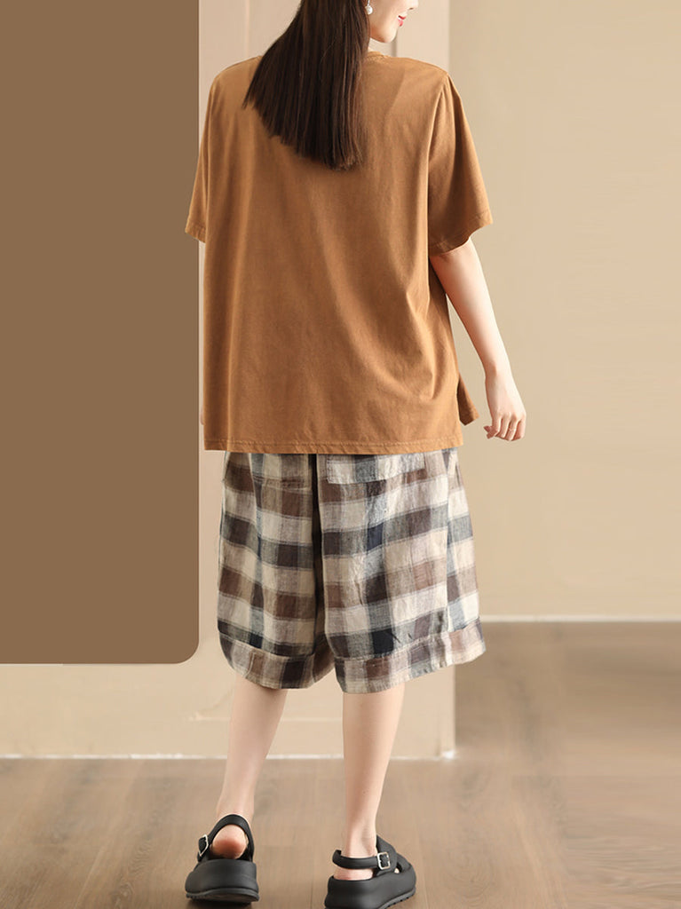Women Summer Casual Plaid Linen Wide-leg Pants PP1028