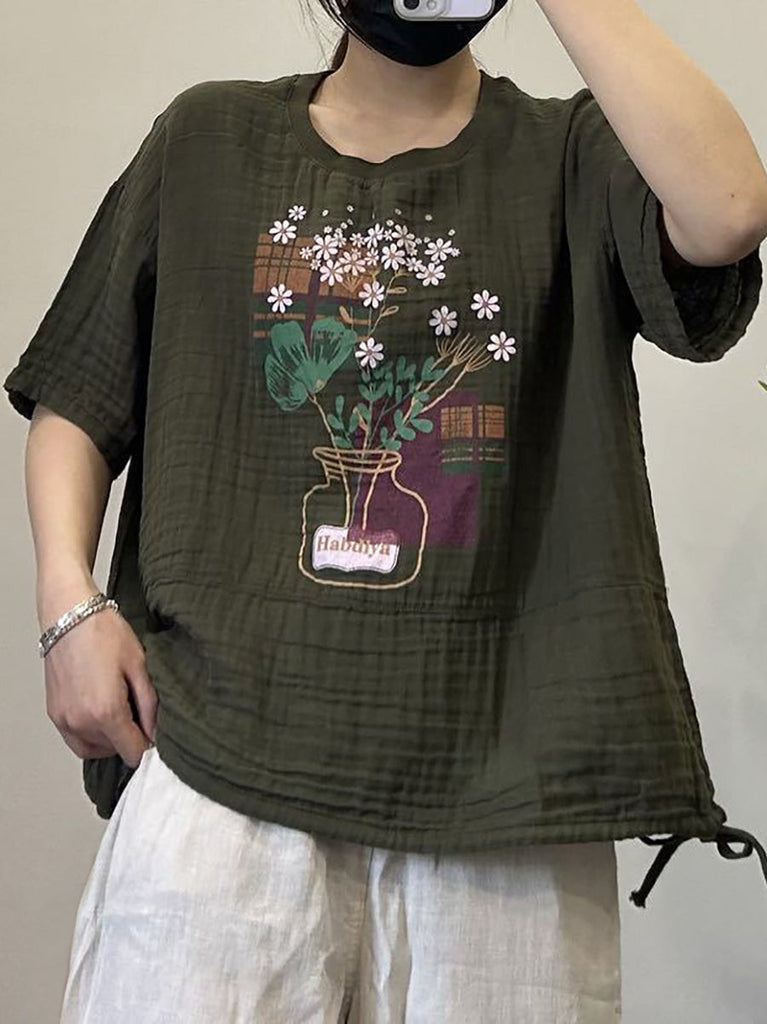 Women Summer Casual Print Strap Hem Cotton Shirt LL027