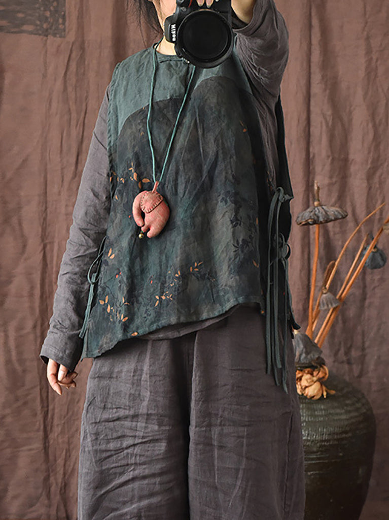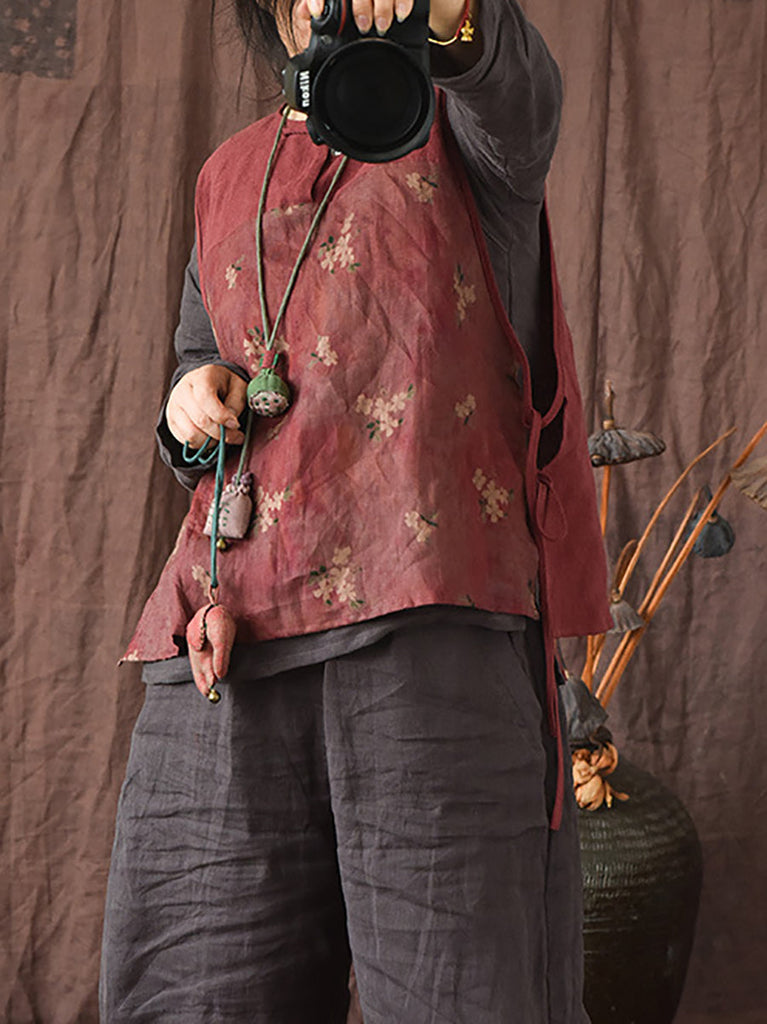 Women Summer Ethnic Floral Strap Linen Vest OP1003