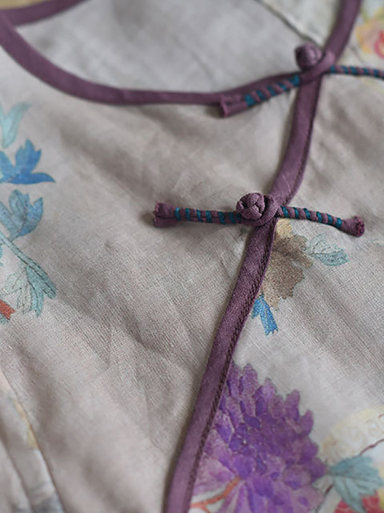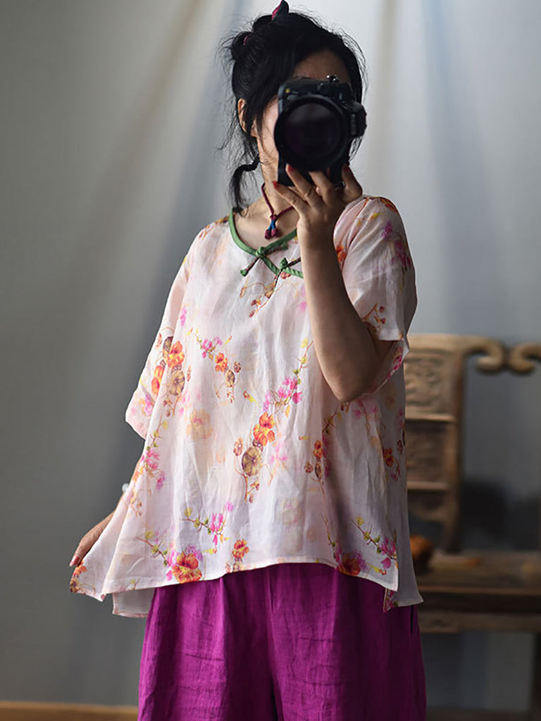 Women Summer Ethnic Floral V-Neck Buckle Ramie Shirt RR1003