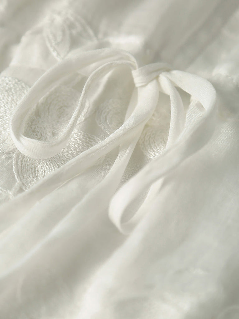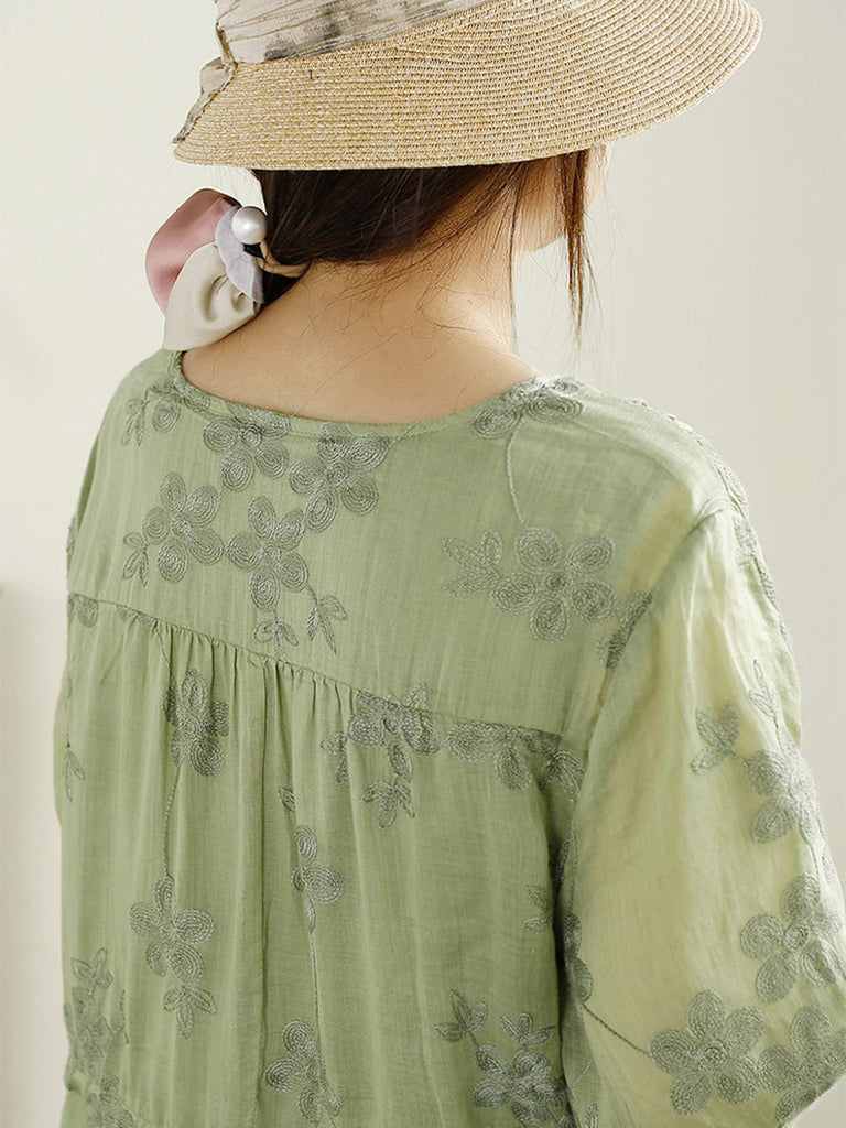 Women Summer Floral Embroidery Strap V-Neck Ramie Dress HH045