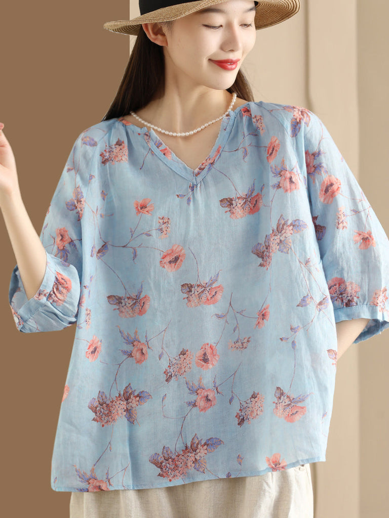 Women Summer Flower V-Neck Ramie Loose Shirt OO1035