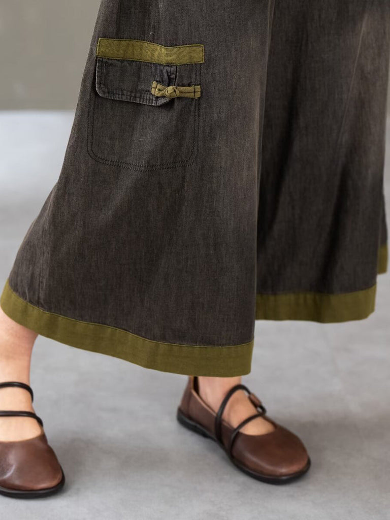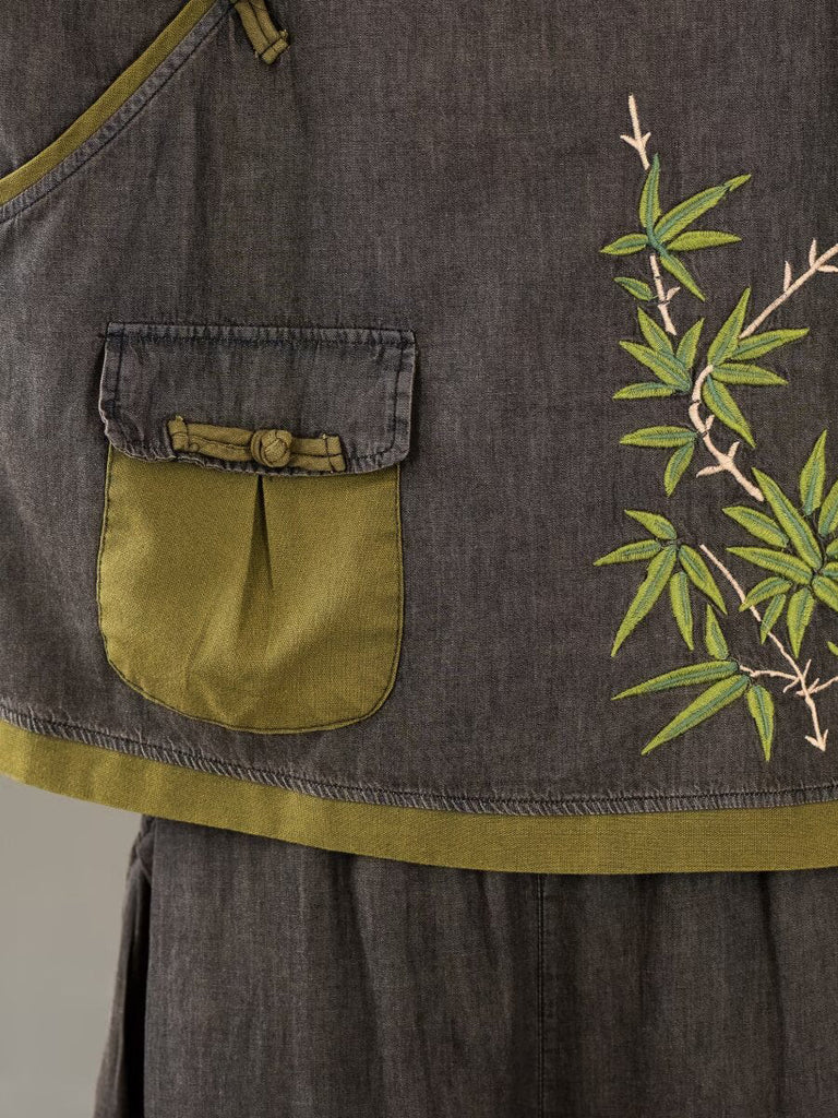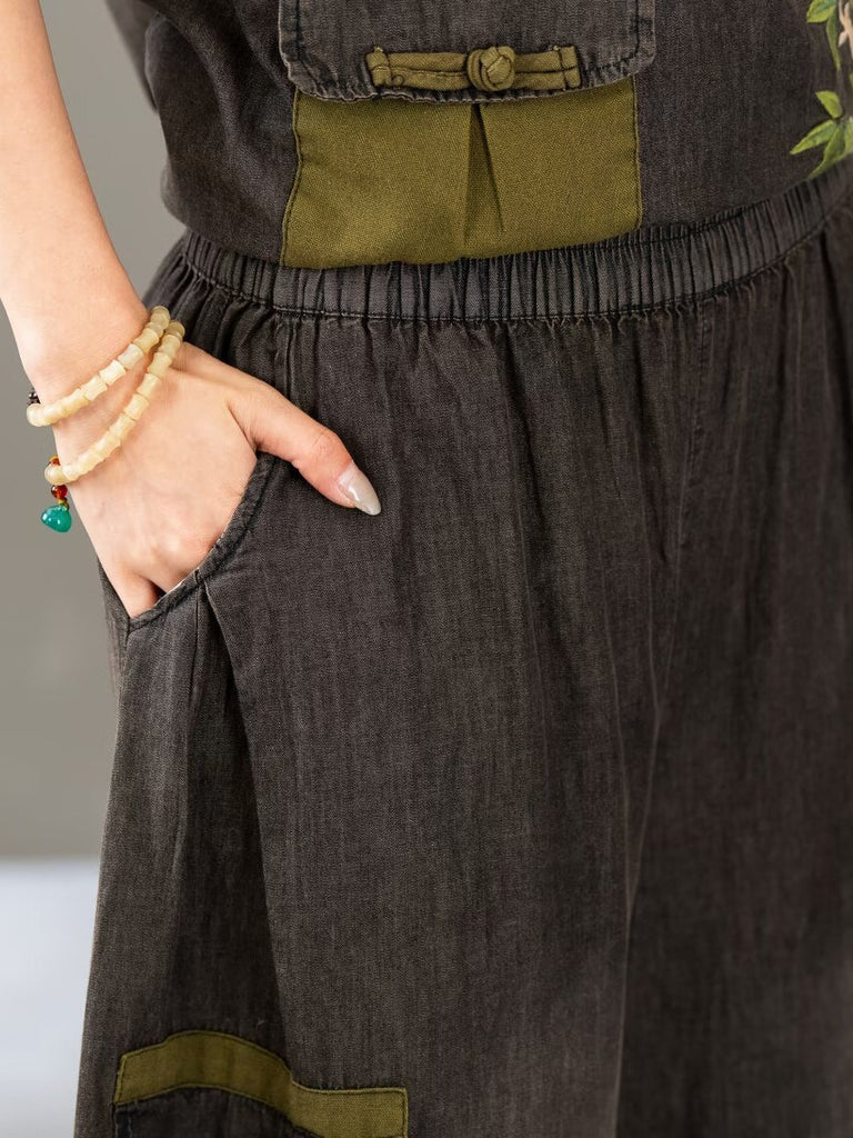 Women Summer Retro Colorblock Embroidery Denim Suits FG1011