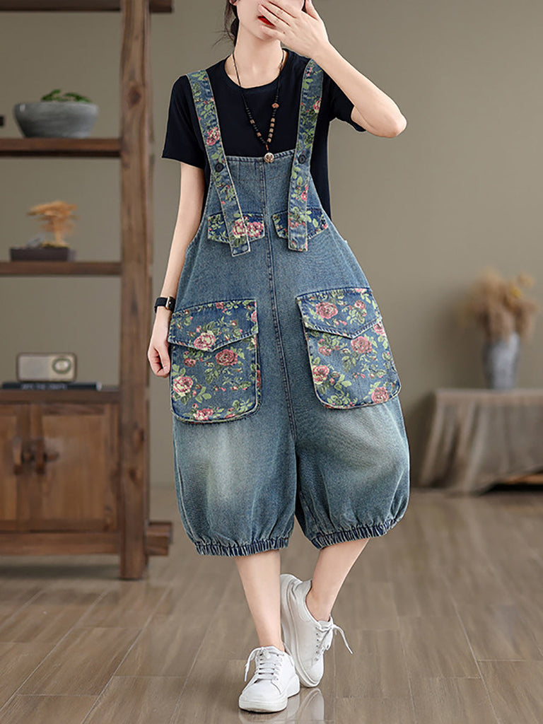 Women Summer Retro Flower Spliced Denim Jumpsuits BN1030