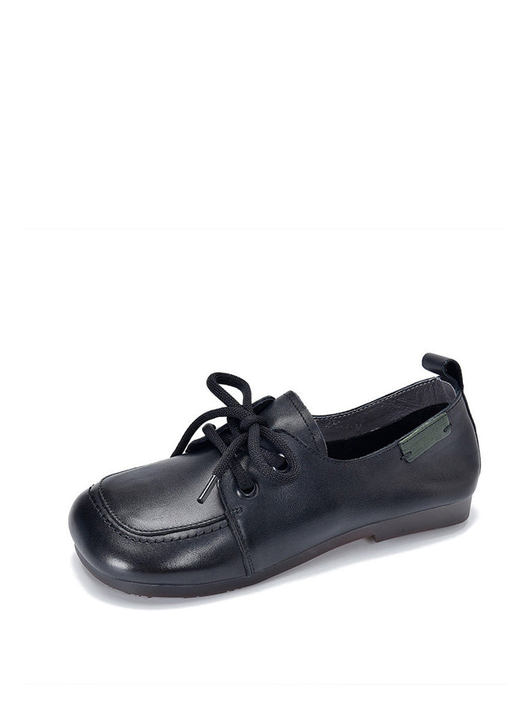 Women Summer Retro Solid Leather Square Toe Flat Shoes CX041