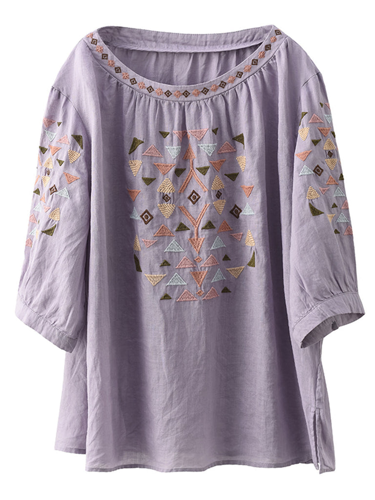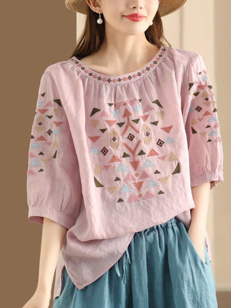 Women Summer Vintage Embroidery O-Neck Ramie Shirt OP1042