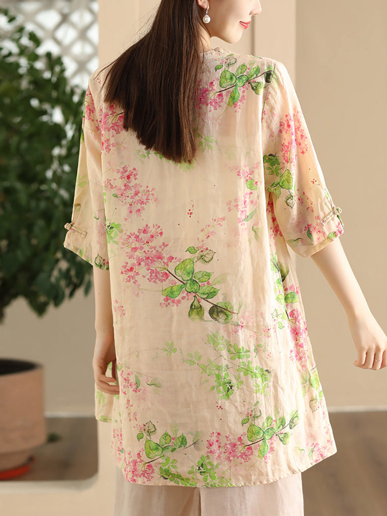 Women Summer Vintage Flower Buckle Ramie Long Shirt LL039