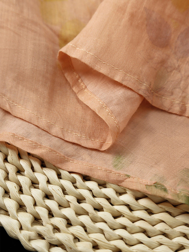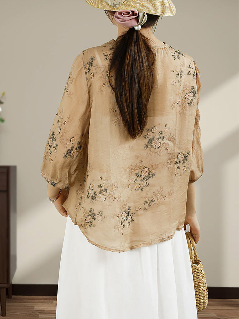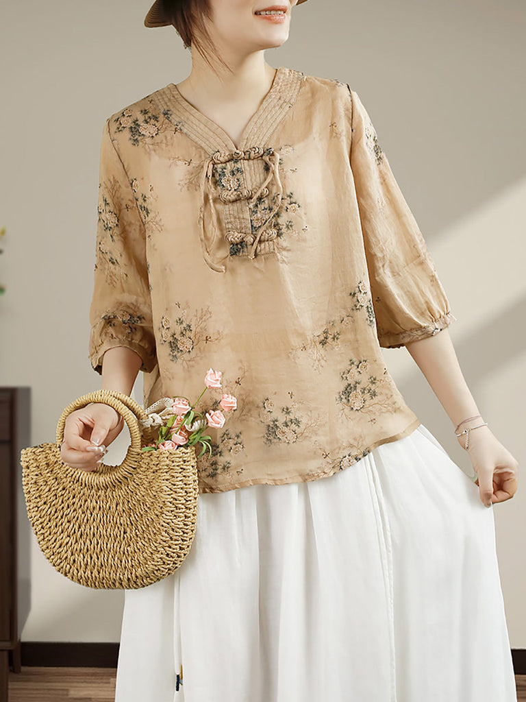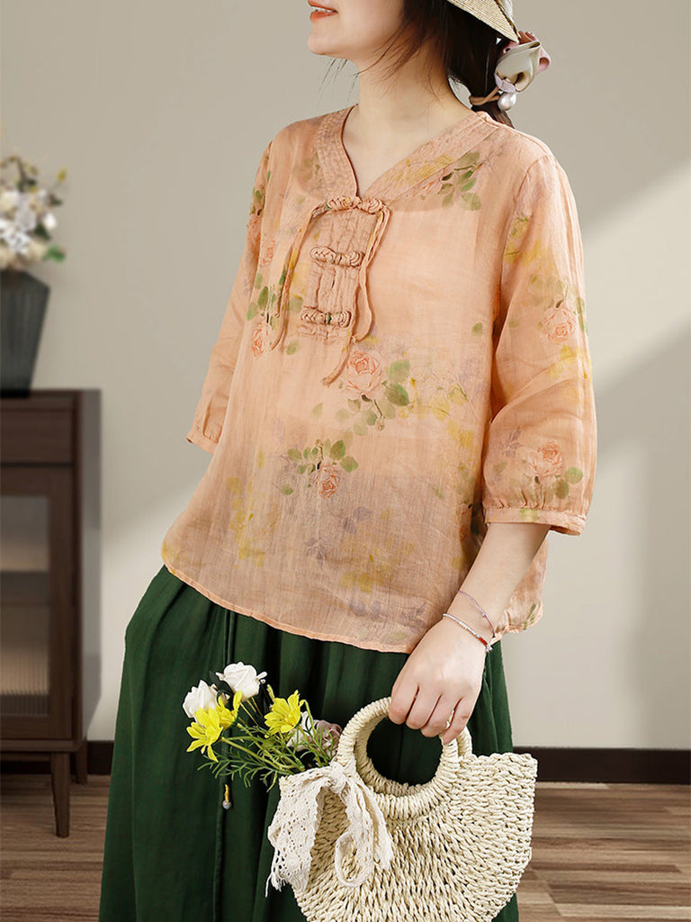 Women Summer Vintage Flower Buckle V-Neck Ramie Shirt HH014