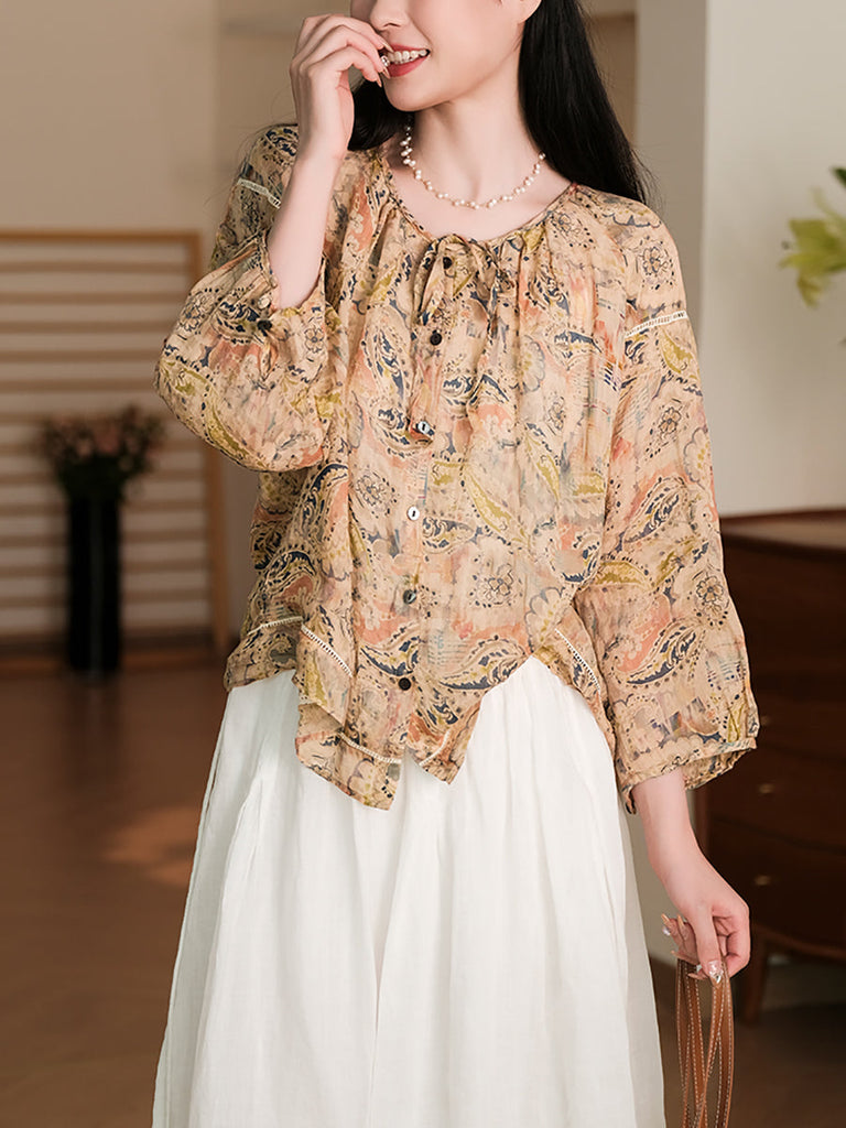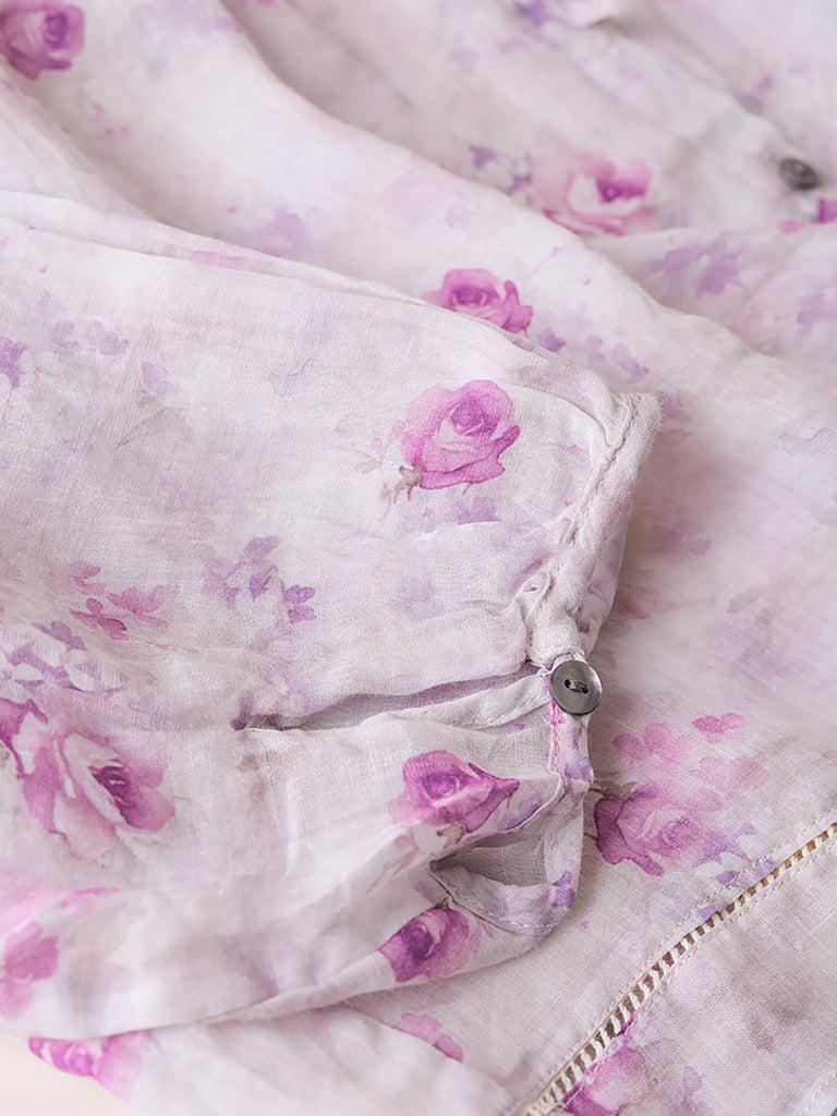 Women Summer Vintage Flower Button-Up Ramie Shirt RR1013