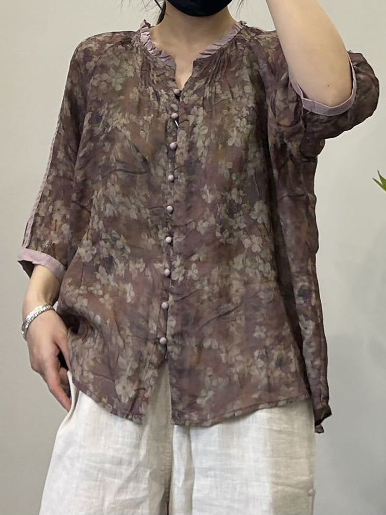 Women Summer Vintage Flower Button-Up V-Neck Ramie Shirt OP1054